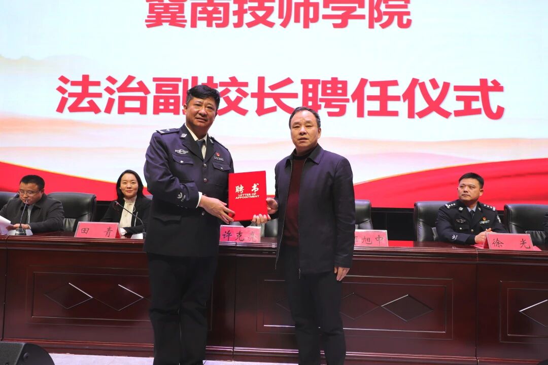 仪式环节,院长田青首先宣读《冀南技师学院关于聘任法治副校长的决定》,明确法治副校长在校园法治教育、学生权益保护、预防违法犯罪等方面的职责。随后,党委书记许克亮为受聘法治副校长颁发聘书,标志着学院与邯郸监狱在青少年法治教育领域的合作正式启动。