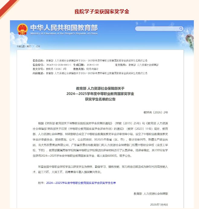 近日,教育部、人力资源和社会保障部公布2024-2025学年度中等职业教育国家奖学金获奖名单。冀南技师学院6名优秀学子凭借精湛的专业技能、出色的学业表现与全面的综合素质脱颖而出,荣获此项国家级荣誉。这份荣誉不仅是对他们勤学苦练的肯定,更是学院深化教育教学改革、培育高素质技术技能人才的生动体现。