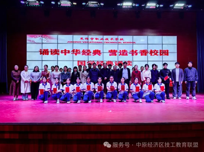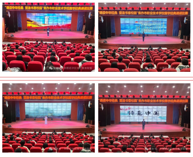 为进一步弘扬中华优秀传统文化,营造书香校园,丰富学校人文底蕴,提高学生的文化素质和道德修养,11月3日下午,焦作市职业技术学校团委在学术报告厅举办了以“诵读中华经典 营造书香校园”为主题的国学经典诵读比赛。校党委书记吴林强、纪委书记慕小永、副校长张涛等领导出席,相关科室负责人、各学部团总支书记及300余名青年学生共同参加了本次比赛。