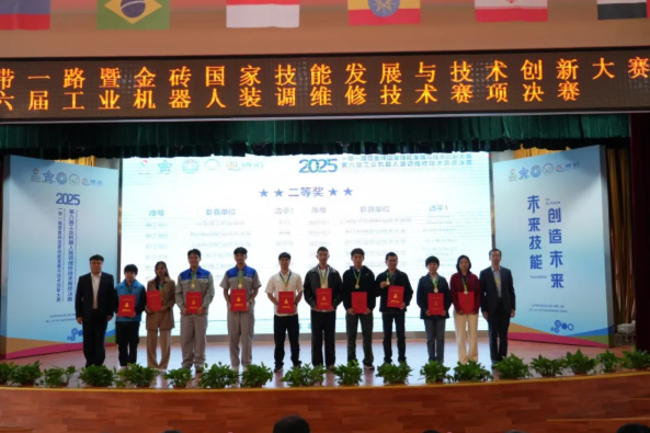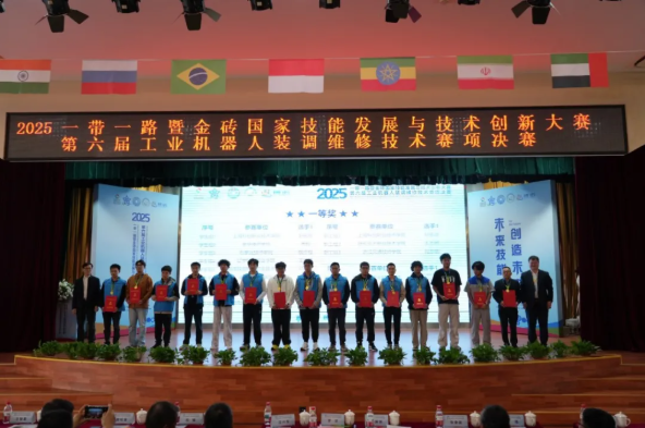 在上海举办的2025年第六届“一带一路暨金砖国家技能发展与技术创新大赛”工业机器人装调维修技术赛项决赛中,我院师生表现卓越,斩获多项荣誉,并成功晋级2026年摩洛哥北非国际赛,并将代表中国角逐国际赛场。