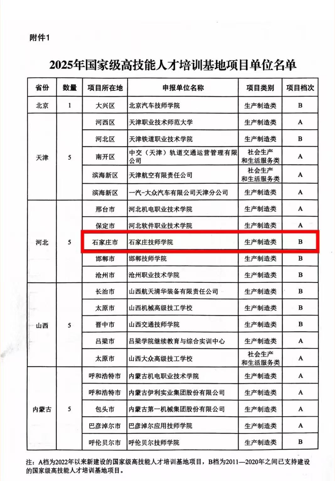 近日,人力资源社会保障部办公厅、财政部办公厅联合发布《关于公布2025年国家级高技能人才培训基地和技能大师工作室项目单位备案名单的通知》(人社厅函〔2026〕12号),石家庄技师学院成功入选2025年国家级高技能人才培训基地项目单位,这是学院第三次获批该国家级资质,标志着学院在高技能人才培养领域的办学实力与示范引领作用再次获得国家层面的高度认可。